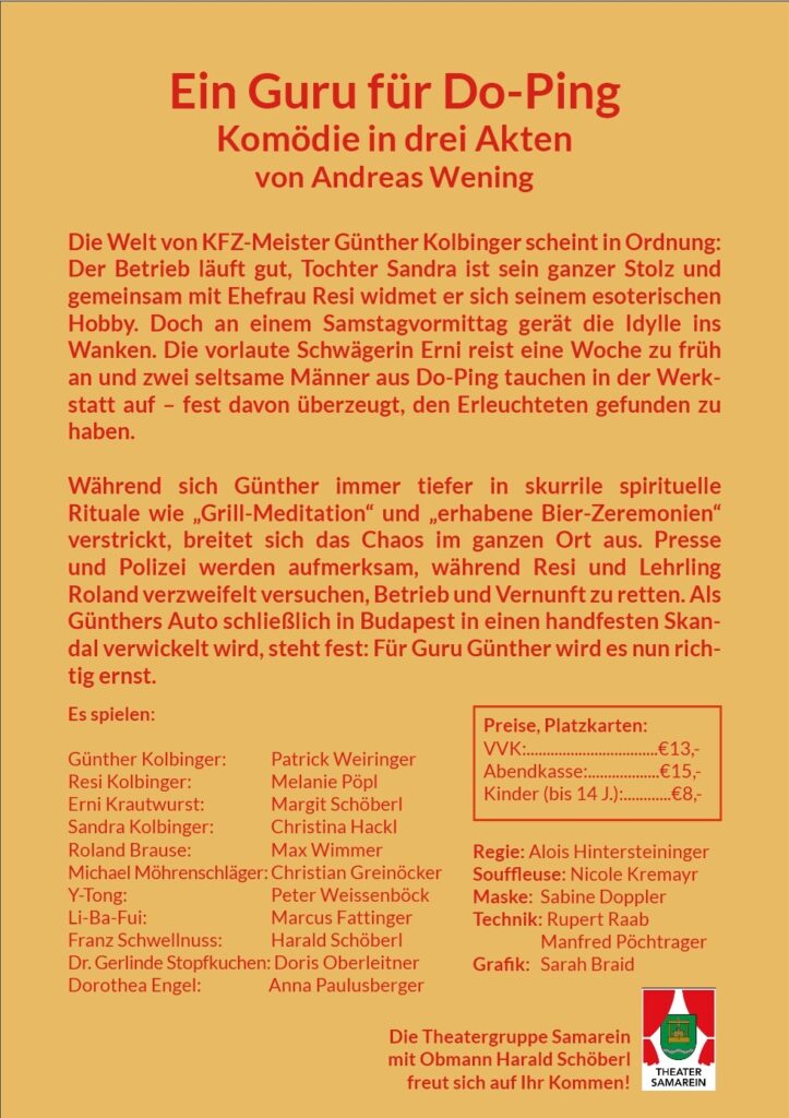 Die Welt von KFZ-Meister Günther Kolbinger scheint in Ordnung. Der Betrieb läuft gut. Tochter Sandra ist sein ganzer Stolz und gemeinsam mit Ehefrau Resi widmet er sich seinem esoterischen Hobby. Doch an einem Samstagvormittag gerät die Idylle ins Wanken. Die vorlaute Schwägerin Erni reist eine Woche zu früh an und zwei seltsame Männer aus Do-Ping tauchen in der Werkstatt auf – fest davon überzeugt den Erleuchteten gefunden zu haben.